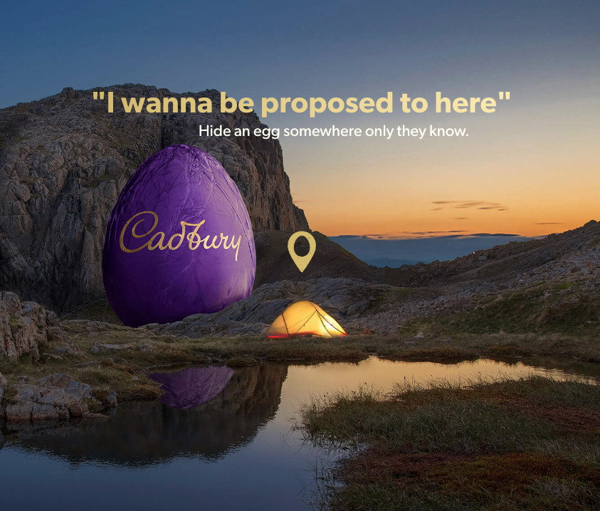 One of the out-of-home ads shows a giant Cadbury Easter egg next to a tent under a sunrise, with the clue “I wanna be proposed to here”.